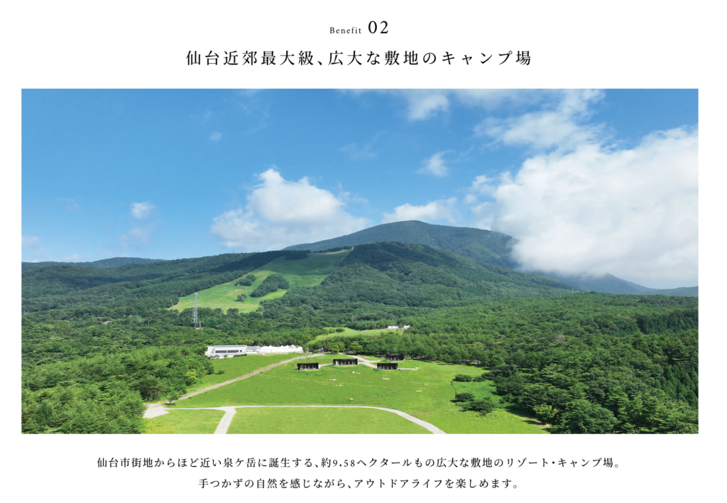 標高約500mに位置するこのキャンプ場は、澄んだ空気と、見渡す限りの山並みが特徴で、仙台では数少ない“整う”が叶うアウトドアスポットだ。