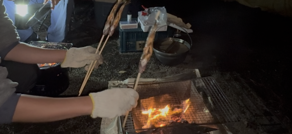 七輪から秋の香りが空に昇っていき、今夜のキャンプを彩る。